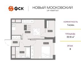 Прямая продажа от застройщика. Беспроцентная рассрочка. 1-к квартира в ЖК Up-квартал "Новый Московский" на 8-м этаже. Общая площадь 33,9. Без отделки.