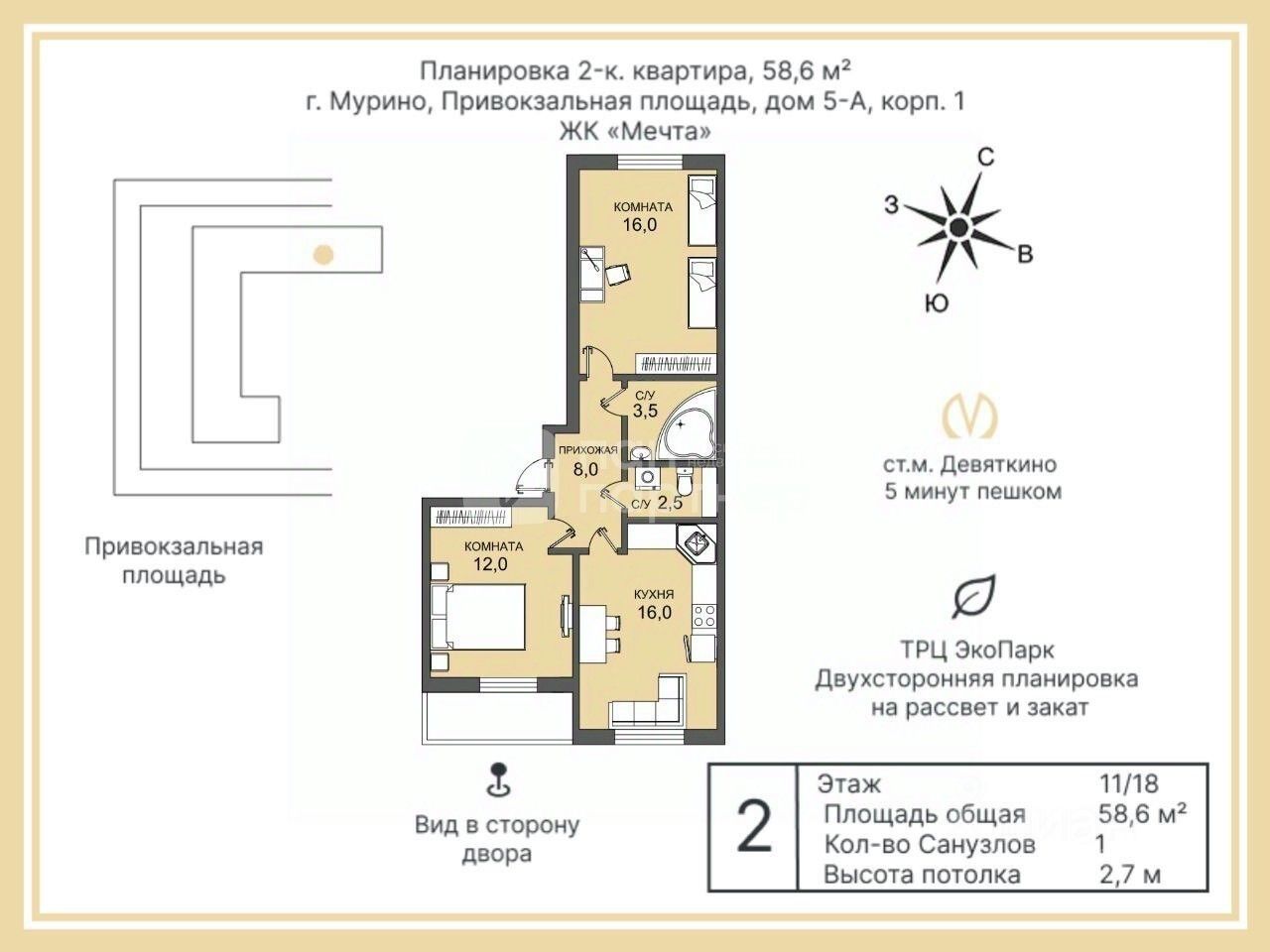 О КВАРТИРЕ. Очень удобная планировка, качественный современный ремонт, общая площадь 58 метров, просторная кухня - 16 кв.м. (большая кухонная зона позволит реализовывать все кулинарные фантазии и собирать семью на совместные трапезы), две спальни 16,3 кв.м. и 14,8 кв.м., грамотно организованный раздельный санузел. Окна выходят на 2 стороны: окна во двор, открывающие обзор на зеленую тихую зону, позволяют наблюдать за гуляющими детьми на современной безопасной площадке, окна, выходящие на улицу открывают обзор на свободное пространство, что редко в современном городе.Квартира оборудована удобными современными системами хранения вещей, которые вместе с кухонной мебелью и техникой остаются новому владельцу квартиры.