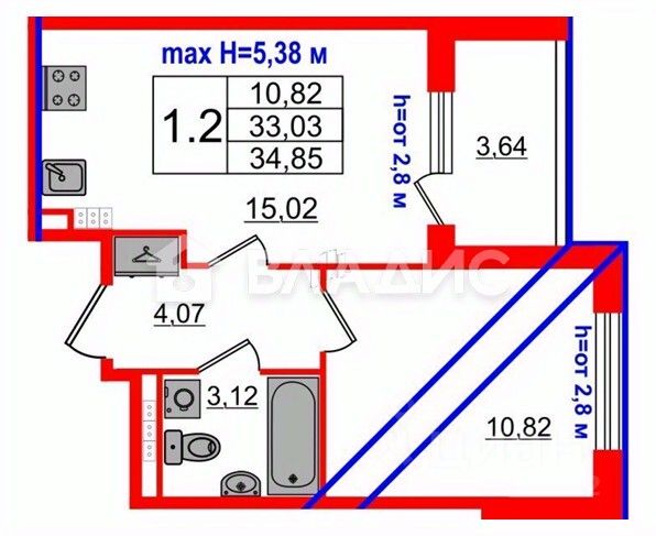 + Общая площадь - 33,03 кв м