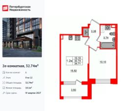 Удобная, классическая, функциональная европланировка, большая кухня-гостиная 15.52 м², вместительная прихожая 3.38 м². Общая площадь квартиры - 32.74 м², жилая 10.1 м², высота потолка 2.75 м.