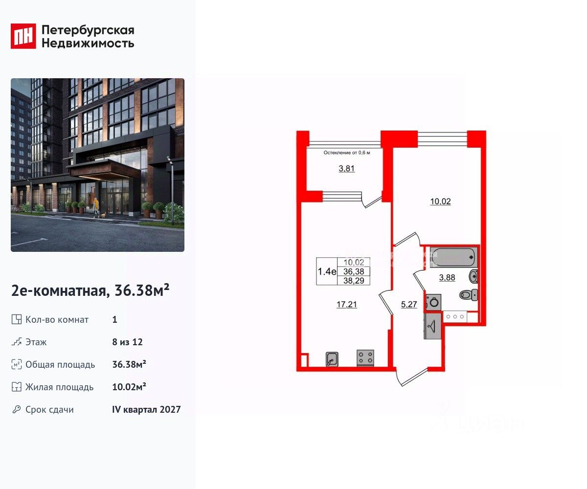 Удобная, классическая, функциональная европланировка, большая кухня-гостиная 17.21 м², просторная прихожая 5.27 м². Общая площадь квартиры - 36.38 м², жилая 10.02 м², высота потолка 2.75 м.