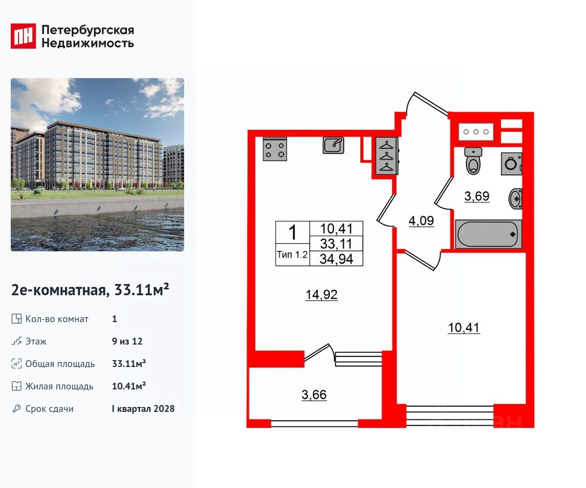 Удобная, классическая, функциональная европланировка, большая кухня-гостиная 14.92 м², просторная прихожая 4.09 м². Общая площадь квартиры - 33.11 м², жилая 10.41 м², высота потолка 2.77 м.