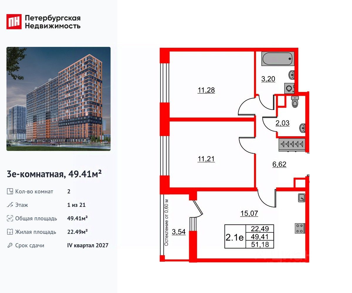 Удобная, классическая, функциональная европланировка, большая кухня-гостиная 15.07 м², вместительная прихожая 6.62 м². Общая площадь квартиры - 49.41 м², жилая 22.49 м², высота потолка 2.77 м.