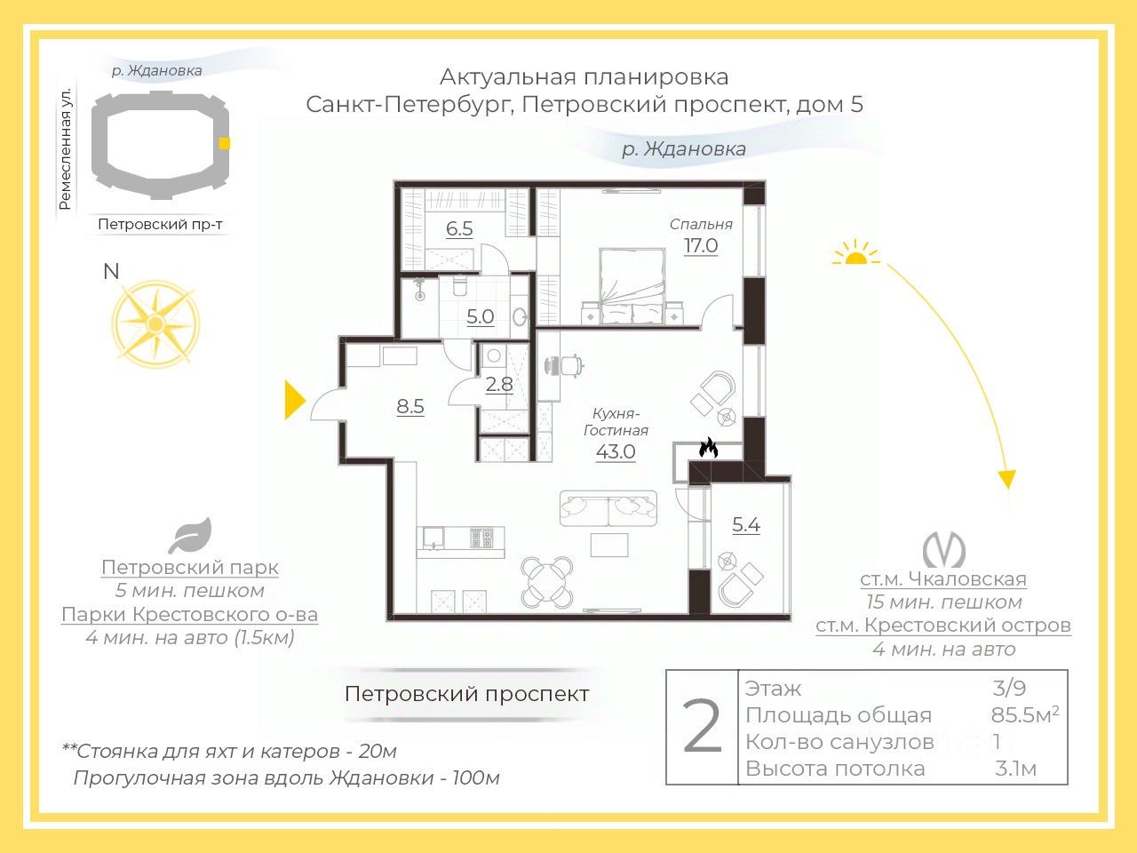 Жилой комплекс расположен в начале острова, что позволяет миновать пробки. У дома собственная набережная, рядом сквер и пруд для прогулок. Закрытый двор с красивым ландшафтом. Метро в пешей доступности.