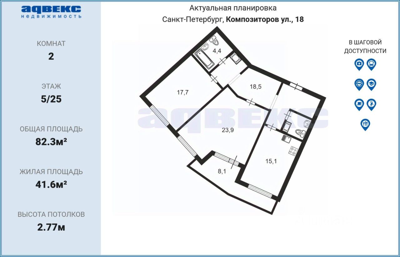 До метро Проспект Просвещения 15 минут пешком. Рядом с домом - лицей в новом современном здании с бассейном , детский сад, магазин Окей, остановка автобусов до станций метро Озерки, Пр. Просвещения, Комендантский проспект. В 5 минутах ходьбы вся необходимая для жизни инфраструктура: фитнес клуб, торговый центр, поликлиники и частные медцентры, множество кафе, ресторанов, аптеки, сетевые магазины. В пешей доступности красивейшие Суздальские озера с оборудованными пляжными зонами, Шуваловский парк, теннисные корты, Вейк парк и множество других развлечений и спорта для детей и взрослых. Удобная транспортная развязка, выезды на КАД и ЗСД.