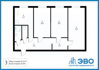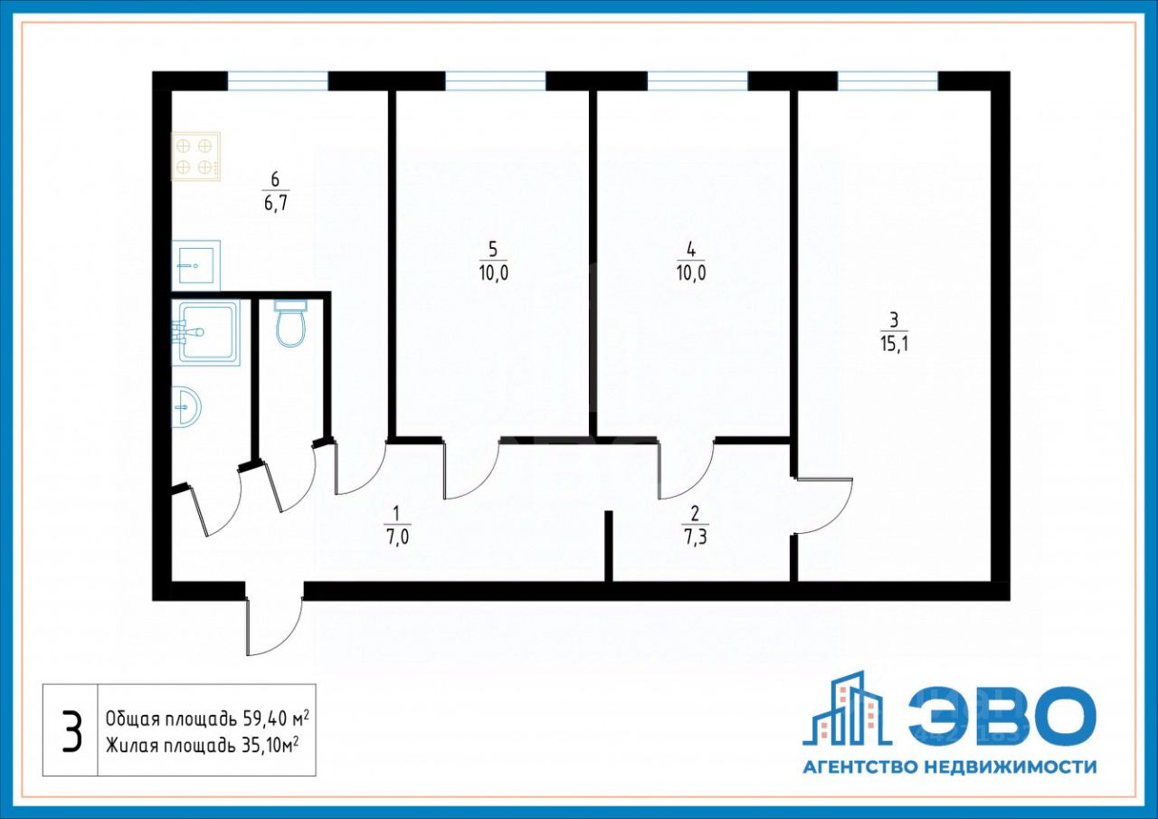 59,4 м² с отличной планировкой: комнаты изолированы, что обеспечивает максимальный комфорт.