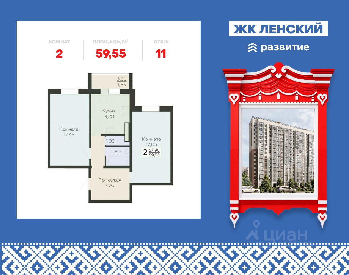 В продаже квартира площадью 59.55 кв. м с предчистовой отделкой на 11 этаже 16 этажного дома. Квартира находится в 5 корпусе: