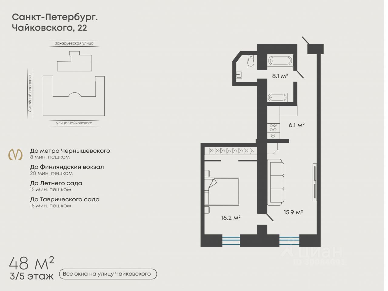 Улица Чайковского находится в зоне "золотого треугольника", идеальной для комфортной жизни в центральном районе. На улице нет активного движения и толп туристов, при этом имеется развитая социальная инфраструктура: магазины, банки, салоны и модные рестораны.