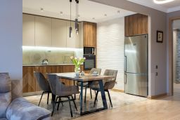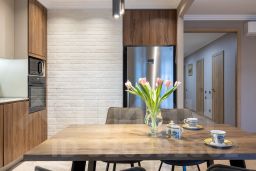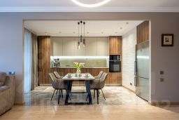 Здесь все продумано до мелочей: в зоне столовой большой стол и большой холодильник, в зоне гостиной угловой диван и ТВ зона, спальни оборудованы с полным наполнением для семьи с детьми, в каждой комнате продуманы места хранения вещей, а для уборки и стирки, имеется постирочная.