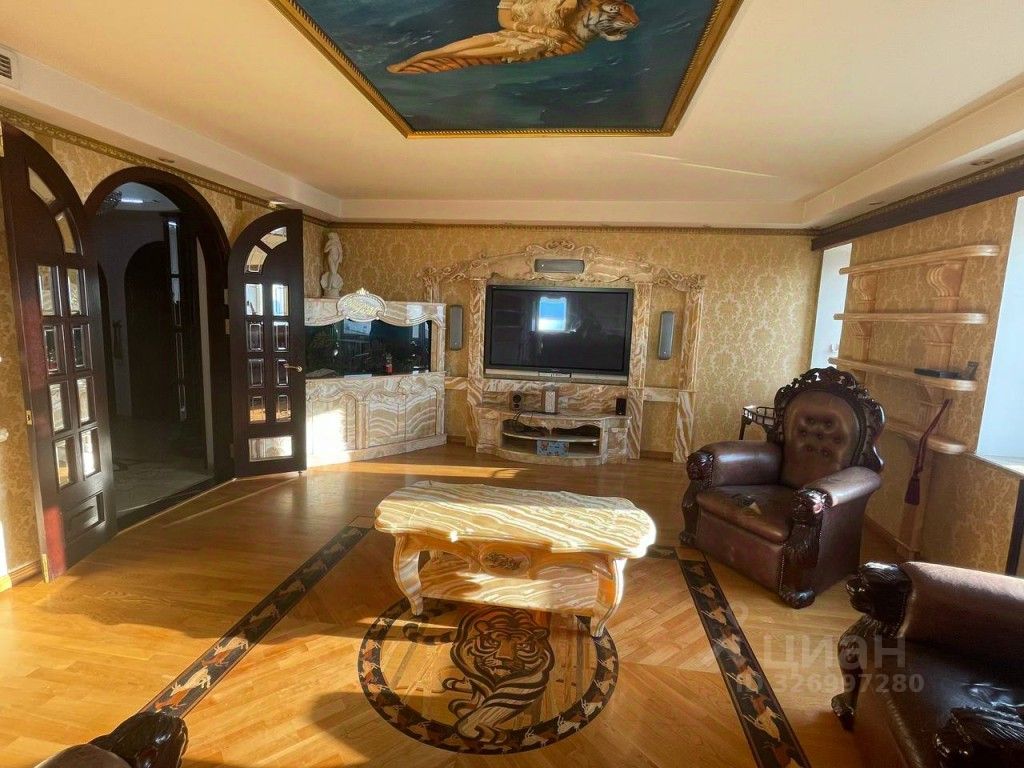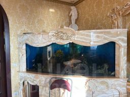 - Просторная гостиная с действующим камином! Встроенный большой аквариум. Мебель: стол из цельного природного камня (оникс), диван и два кресла. Техника: Большая плазменная панель Раnаsоniс с акустической системой Svеn. Шикарный вид на Неву, Финский залив, Лахта центр и стадион Газпром Арена.