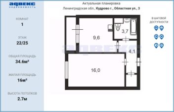 * Общая площадь 34.6 м2. В прихожей есть ниша под шкаф.