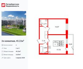 Удобная, классическая, функциональная европланировка, большая кухня-гостиная 17.72 м², просторная прихожая 7.13 м². Общая площадь квартиры - 45.22 м², жилая 14.07 м², высота потолка 2.77 м.