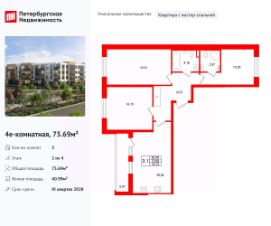 Уникальная, функциональная европланировка, большая кухня-гостиная 18.34 м², вместительная прихожая 9.23 м². Общая площадь квартиры - 75.69 м², жилая 40.99 м², высота потолка 2.77 м.