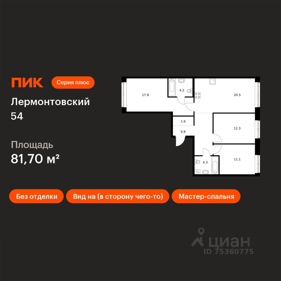 Продаётся 3-комн. квартира площадью 81,7 кв.м на 1 этаже 9 этажного дома (Корпус 2.2, Секция 12) проекта ПИК Лермонтовский 54. Светлый просторный подъезд на уровне земли, функциональная планировка, большие окна, без отделки.