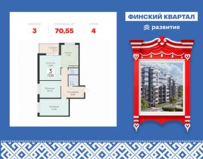 "Продается квартира площадью 70.55 кв. м с предчистовой отделкой. Квартира расположена на 4 этаже 7 этажного дома, в жилом комплексе комфорт-класса "Финский Квартал".