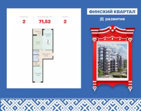 "Продается квартира площадью 71.52 кв. м с предчистовой отделкой. Квартира расположена на 2 этаже 8 этажного дома, в жилом комплексе комфорт-класса "Финский Квартал".