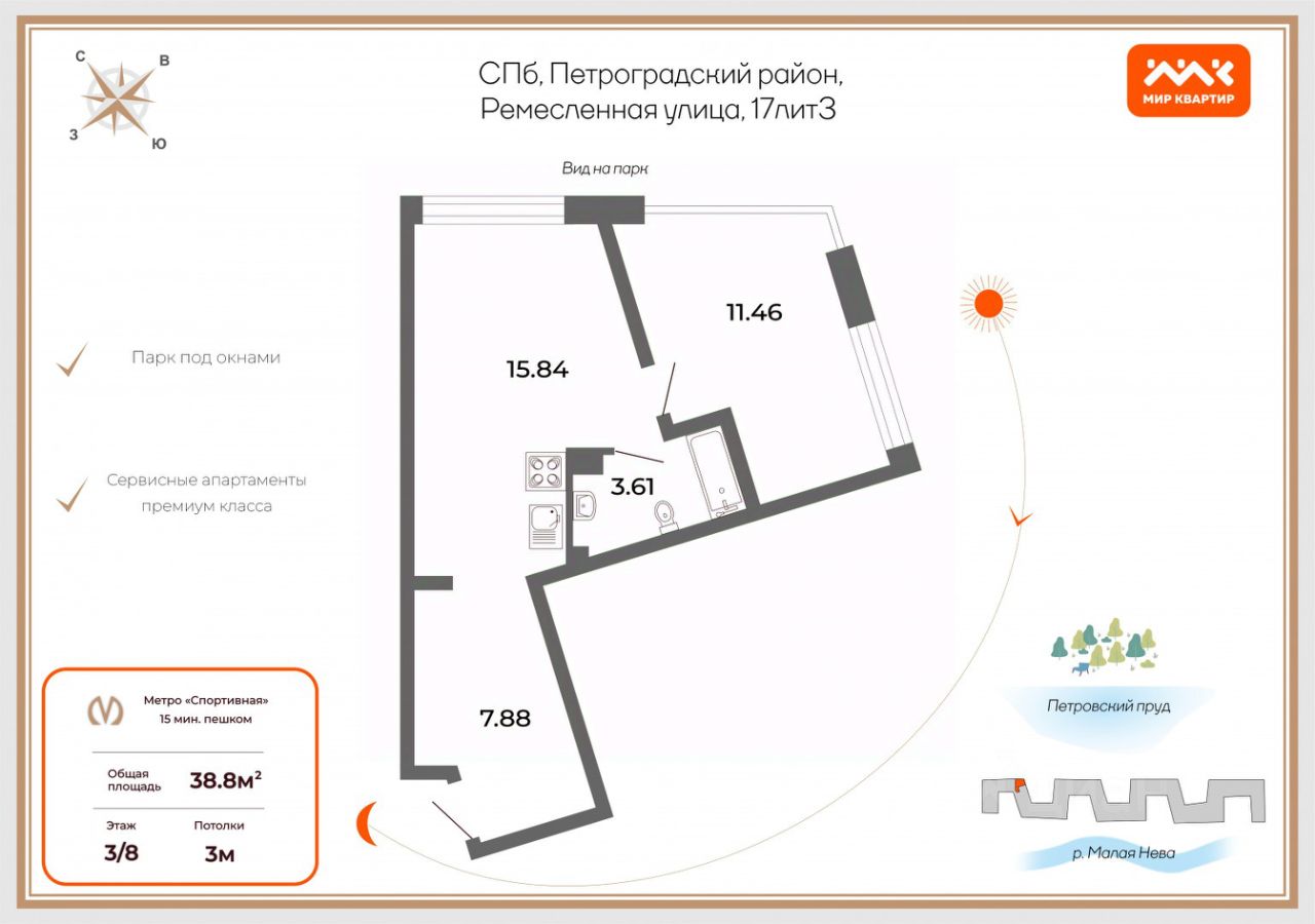 Транспортную доступность обеспечивает мост Бетанкура, Ждановская набережная, до ЗСД 10 минут на автомобиле. Ближайшая зеленая зона - Петровский парк находится под окнами апартаментов.