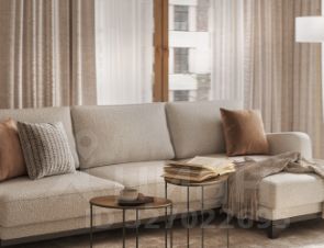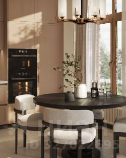 Архитектура угловой кухонной группы выполнена под потолок, что позволяет разместить в шкафах все необходимое. Дубовый шпон на фасадах и эффектная подсветка витрин придают пространству особый шарм. Удобный диван DANTONE в гостиной располагает к отдыху и приятному общению.