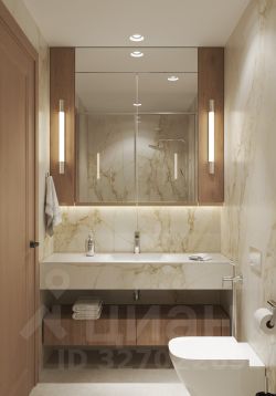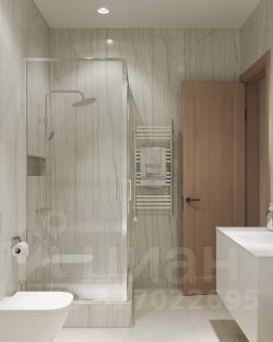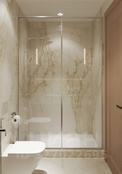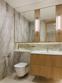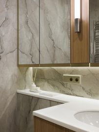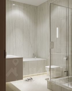Отдельного внимания заслуживает мастер - блок с гардеробной и ванной комнатой, в отделке которой применен крупноформатный итальянский керамогранит с рисунком под марамор Bianco Statuario.