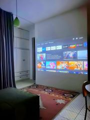 Стена напротив дивана абсолютно гладкая, белая, служит экраном для проектора. Кино на всю стену!