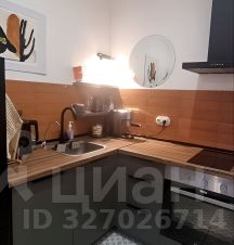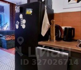 Кухня находится в нише, что отделяет её от зоны отдыха, и оборудована современной техникой, включая холодильник и посудомоечную машину.