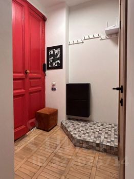 Лeпные розетки на потолке отреставрированы, настоящая кирпичная стена заботливо очищена мастерами, сохранен и восстановлен дубовый паркет. Вторая входная дверь из массива дерева акцентно выкрашена в красный - тоже уникальный артефакт этой потрясающей квартиры.