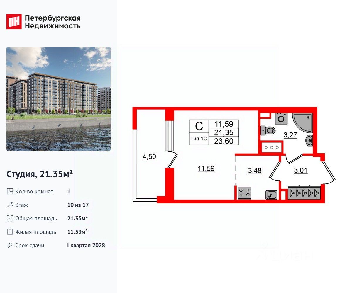Продается уютная студия в жилом комплексе "Setl Ривьера" в активно развивающимся Невском районе. До метро можно добраться на транспорте всего за 10 минут. Удобная, классическая, функциональная европланировка, вместительная прихожая 3.01 м². Общая площадь студии - 21.35 м², жилая 11.59 м², высота потолка 2.77 м. Квартира продается с отделкой "Норд Лайн серый плюс". Что особенного в ЖК "Setl Ривьера"? • Первая береговая линия Невы. 5 км до центра Петербурга • "Активити парк" - пространство для занятий спортом и отдыха. "Ривьера парк" с променадом и панорамной ротондой • Масштабные дворы 10 000 кв.м. с авторским ландшафтным дизайном • Двухуровневые единые входные группы • Видовые квартиры с террасами, каминами и саунами