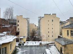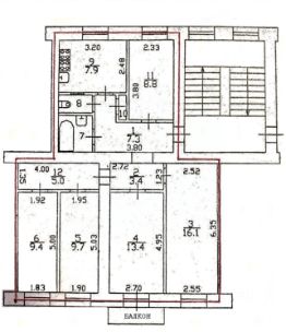 Квартира расположена на четвёртом этаже пятиэтажного дома. Общая площадь составляет 86,3 кв. м, из которых 57,4 кв. м — жилая площадь. Площадь кухни — 7,9 кв. м. Комнаты просторные и светлые, их площадь составляет 8,8 + 9,4 + 9,7 + 13,4 + 16,1 кв. м. Окна выходят на улицу, и в квартире есть балкон, где можно насладиться видом и свежим воздухом.