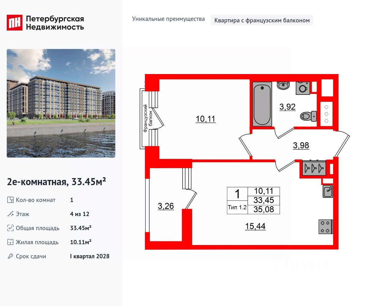 Уникальная, функциональная европланировка, большая кухня-гостиная 15.44 м², вместительная прихожая 3.98 м². Общая площадь квартиры - 33.45 м², жилая 10.11 м², высота потолка 2.77 м.