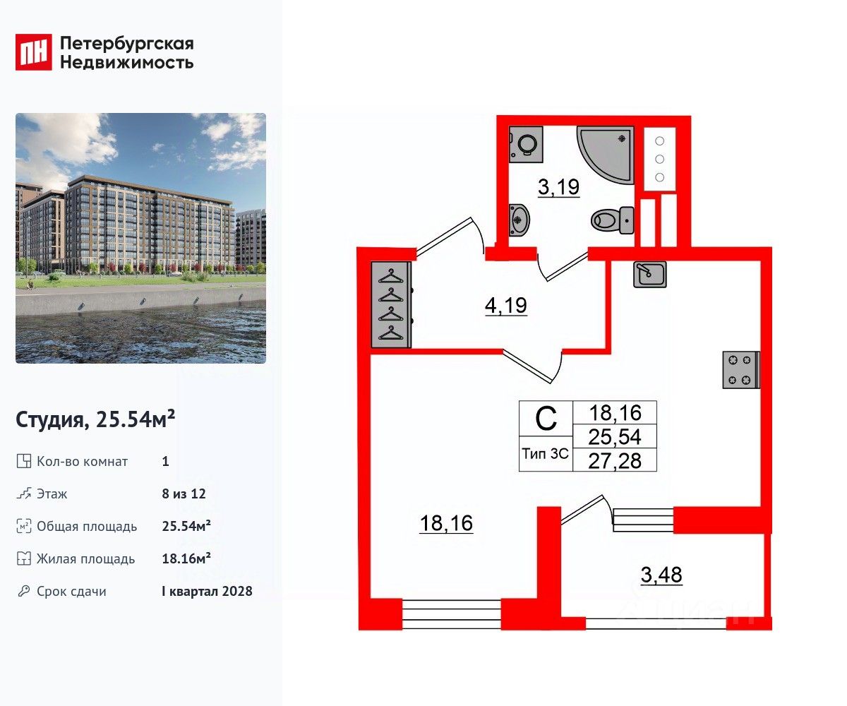 Удобная, классическая, функциональная европланировка, просторная прихожая 4.19 м². Общая площадь студии - 25.54 м², жилая 18.16 м², высота потолка 2.77 м.