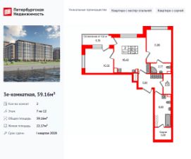 Уникальная, функциональная европланировка, большая кухня-гостиная 16.43 м², вместительная прихожая 5.66 м². Общая площадь квартиры - 59.16 м², жилая 22.17 м², высота потолка 2.77 м.