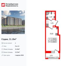 Удобная, классическая, функциональная европланировка, вместительная прихожая 2.76 м². Общая площадь студии - 21.18 м², жилая 15.23 м², высота потолка 2.77 м.