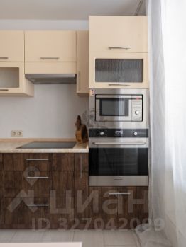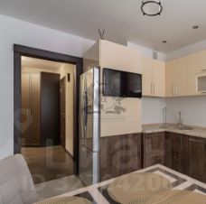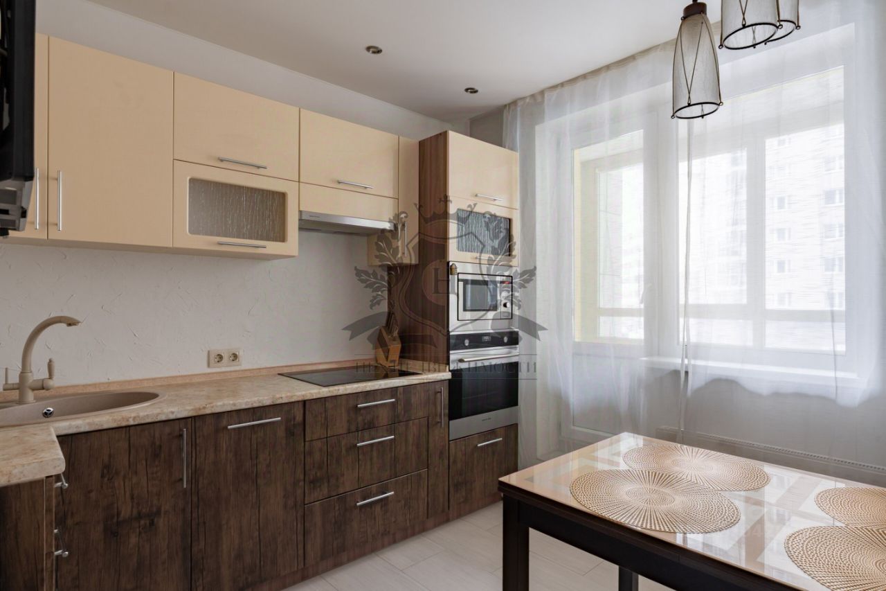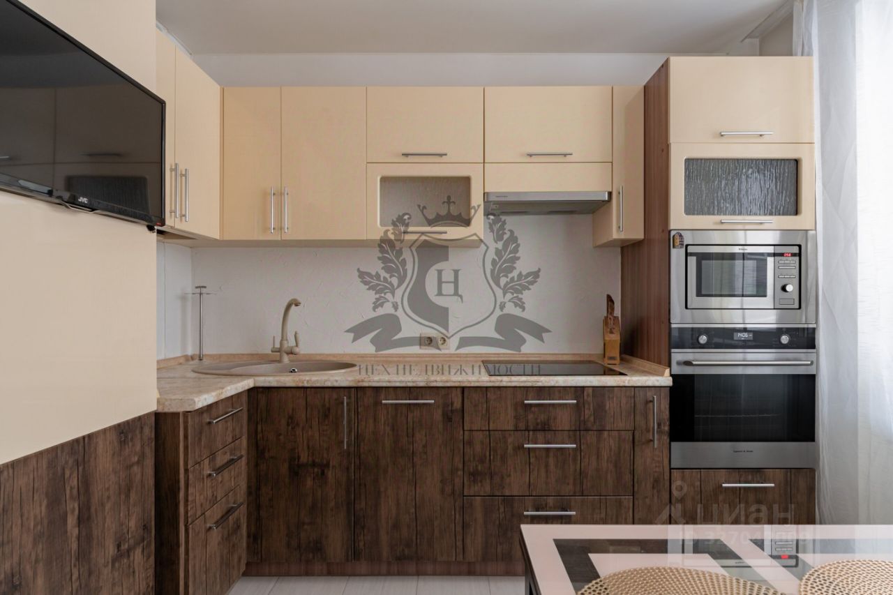 Просторная кухня оборудована всей необходимой мебелью и техникой: раковина из натурального камня, духовой шкаф, микроволновая печь, варочная панель, вместительный двухдверный холодильник, удобный раскладывающийся стол, телевизор. Вся мебель и техника (за исключением стульев) остается будущему владельцу. Из кухни выход на застекленный балкон.