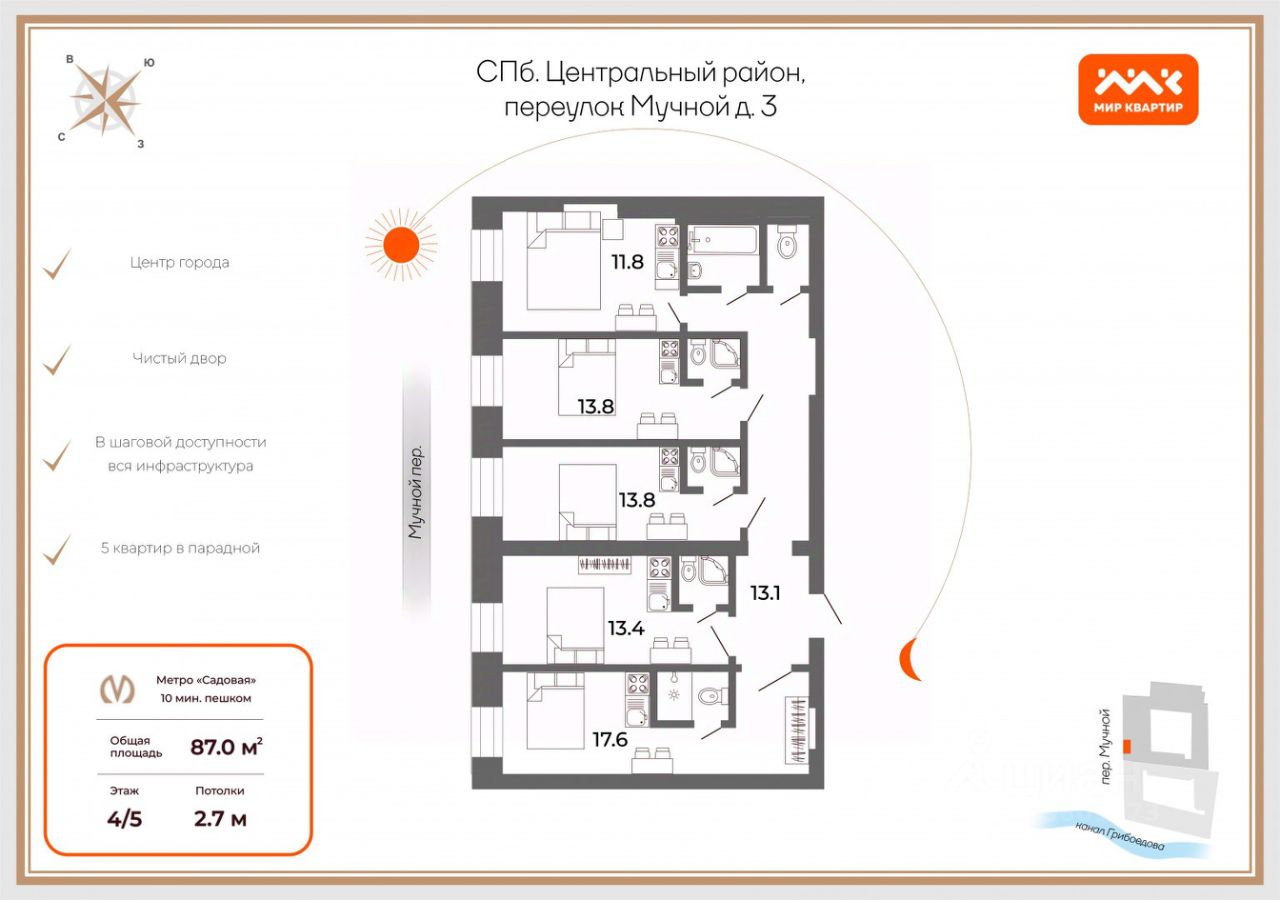всегo в 7 минутaх пeшком от мeтpо "Спасская", мeтpо "Сенная площадь" и "Садовая". В пешей доступности набережная канала Грибоедова, набережная реки Фонтанки и Юсуповский сад. Большое количество магазинов, кафе, баров, ресторанов. Развитая инфраструктура :детские сады, школы, университеты, поликлиники.