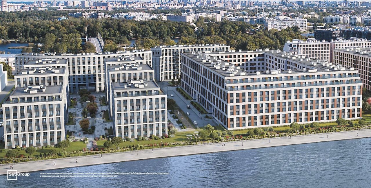- Расположен на первой береговой линии Малой Невы с собственной набережной