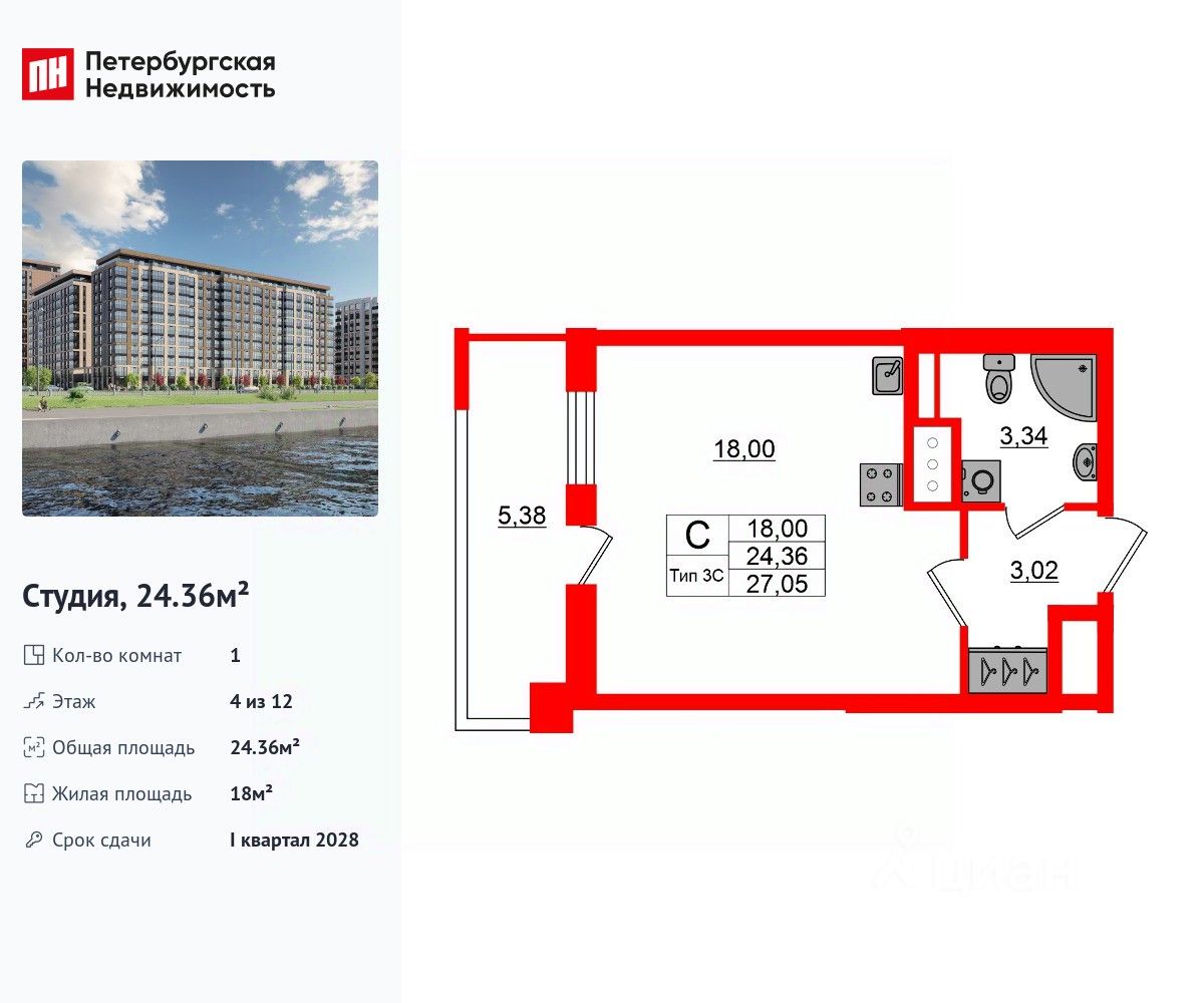 Удобная, классическая, функциональная европланировка, вместительная прихожая 3.02 м². Общая площадь студии - 24.36 м², жилая 18 м², высота потолка 2.77 м.