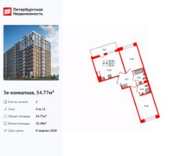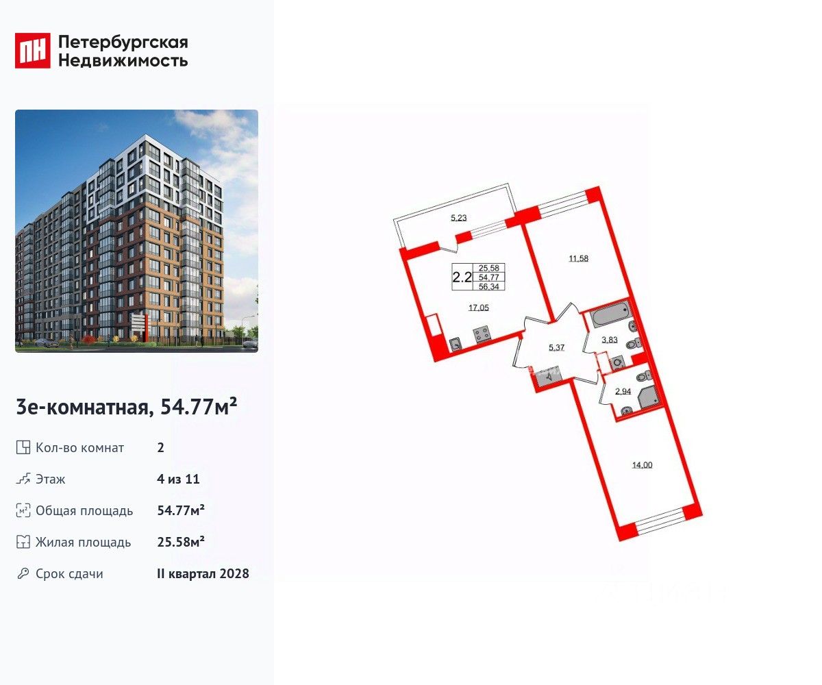 Удобная, классическая, функциональная европланировка, большая кухня-гостиная 17.05 м², вместительная прихожая 5.37 м². Общая площадь квартиры - 54.77 м², жилая 25.58 м², высота потолка 2.77 м.