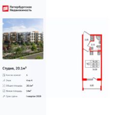 Удобная, классическая, функциональная европланировка, вместительная прихожая 3 м². Общая площадь студии - 20.1 м², жилая 14 м², высота потолка 3.04 м.