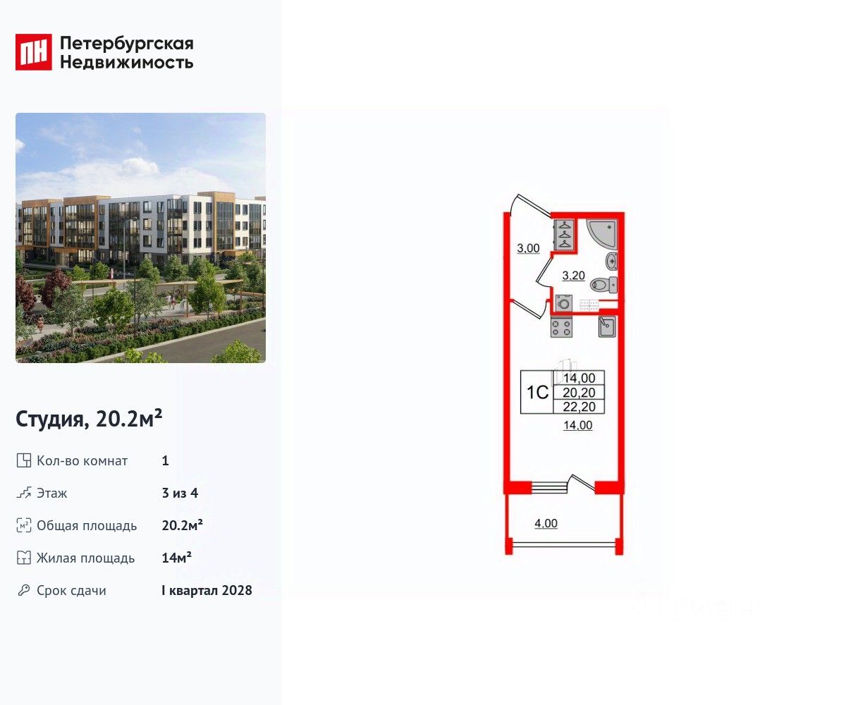 Удобная, классическая, функциональная европланировка, вместительная прихожая 3 м². Общая площадь студии - 20.2 м², жилая 14 м², высота потолка 2.78 м.