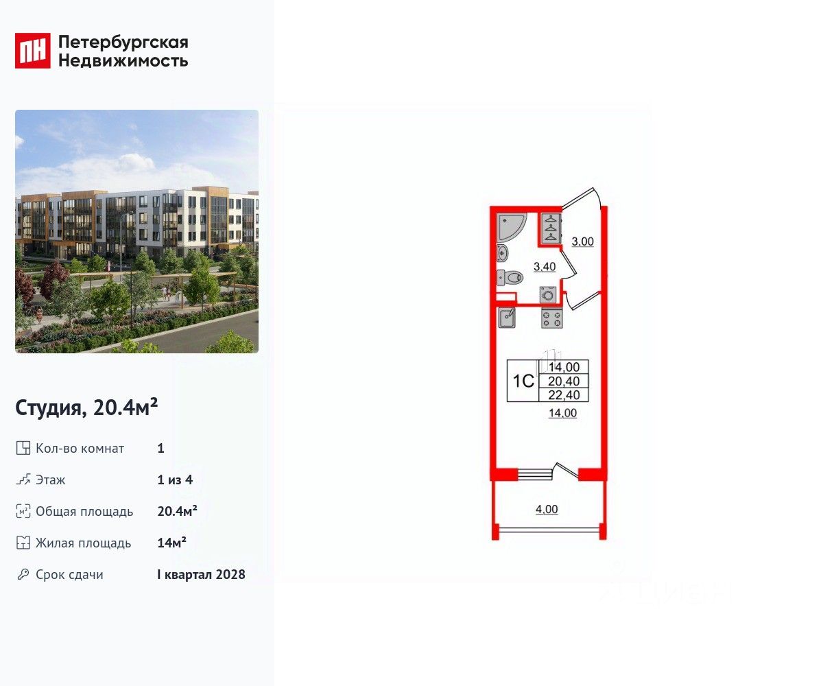 Продается уютная студия от застройщика в жилом комплексе "Univer City" в на юге Санкт-Петербурга. До метро можно добраться на транспорте всего за 30 минут. Удобная, классическая, функциональная европланировка, вместительная прихожая 3 м². Общая площадь студии - 20.4 м², жилая 14 м², высота потолка 2.78 м. Квартира продается с отделкой "Норд Лайн светлый". Что особенного в ЖК "Univer City"? • Малоэтажное строительство • Скандинавские фасады с отделкой керамогранитом, акцентные входные группы • Закрытые внутренние дворы без машин • Пешеходный променад с тематическими зонами, еловый сквер и яблоневый сад • Univer Park, включая SetlSport и SetlKids, площадку для выгула собак и зоны отдыха • Инновационный Лицей Setl с оригинальной архитектурной концепцией и уникальной образовательной средой