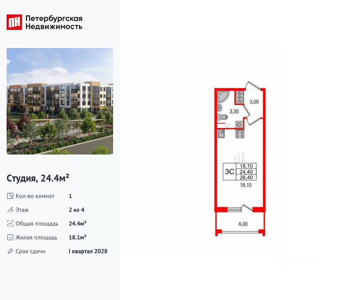 Удобная, классическая, функциональная европланировка, вместительная прихожая 3 м². Общая площадь студии - 24.4 м², жилая 18.1 м², высота потолка 2.78 м.