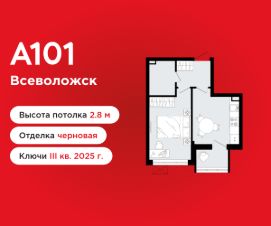 1-комнатная квартира площадью 34.40 в ЖК "А101 Всеволожск" c лоджией на 3 этаже. Квартира без отделки. Вид из окна на улицу. В квартире 1 санузел. Высота потолков 2.8 м.