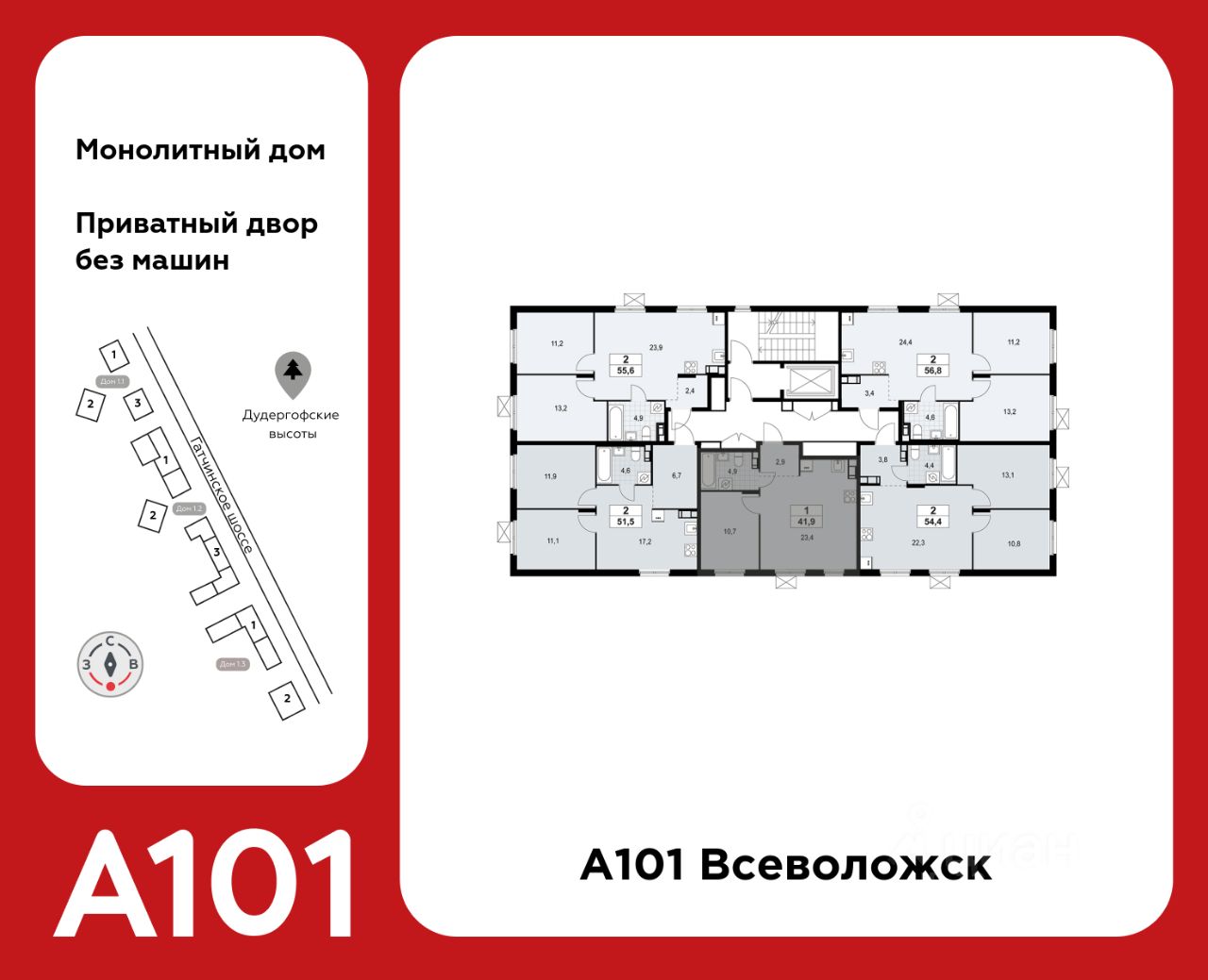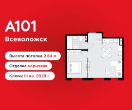 1-комнатная квартира площадью 41.90 в ЖК "А101 Всеволожск" на 3 этаже. Квартира без отделки. Вид из окна на улицу. В квартире 1 санузел. Высота потолков 2.84 м.