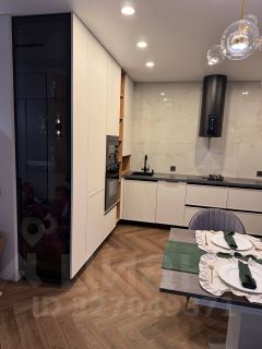 Кухонный гарнитур выполнен на заказ. Полный комплект новой встроенной техники: духовой шкаф, микроволновка, гибридная плита (газ+электро). Посудомоечная машина и холодильник располагаются за фасадами. Мощная вытяжка. Установлен фильтр для воды глубокой очистки.