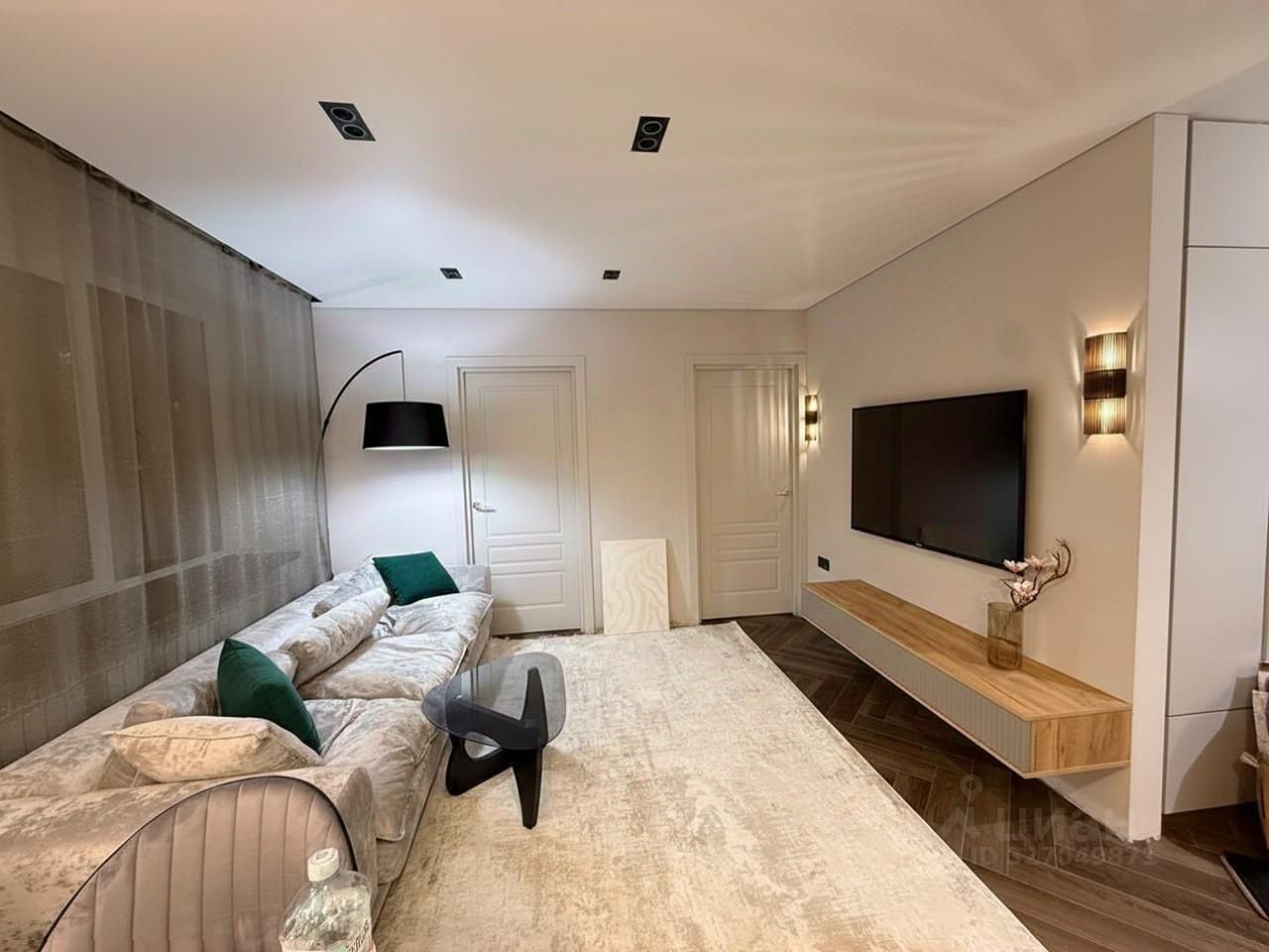 Потолки со встроенной подсветкой и декоративные светильники создают атмосферный свет. Трековое освещение в гостиной позволяет менять сценарии освещения. В ванной также установлена дополнительная декоративная подсветка.