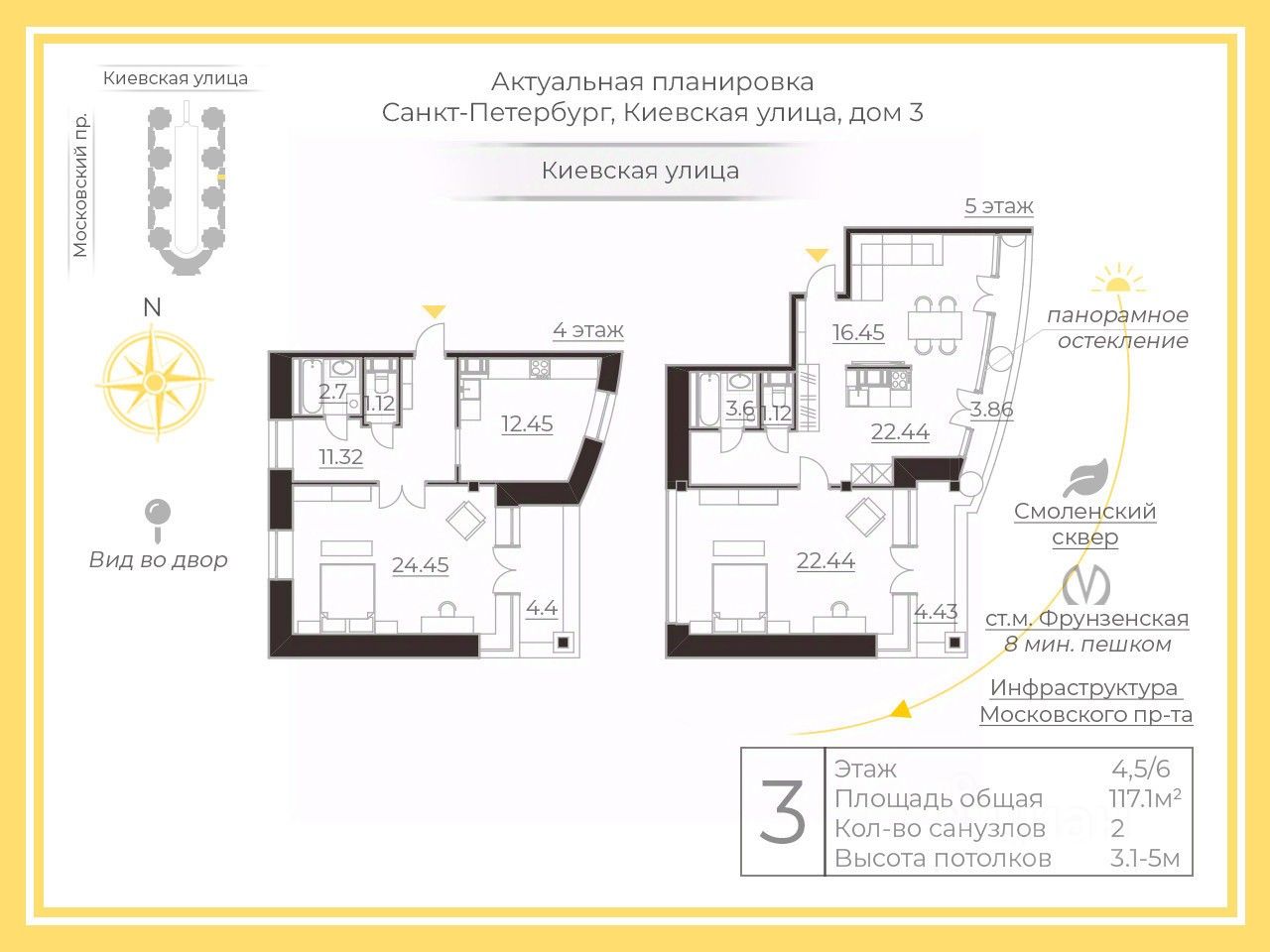 Арт. 131338340 Прекрасная двухэтажная трехкомнатная квартира с отличным ремонтом и панорамным остеклением в жилом комплексе бизнес-класса "Империал", в тихой привилегированной башне, где всего 6 этажей и 10 квартир. Эксклюзивная для данного жилого комплекса квартира расположена на 2-х этажах, с отдельными входами на 4-м и 5-м этажах. Планировка квартиры: на 4-м этаже включает в себя: 1 спальную комнату, кухню, раздельный санузел и балкон; на 5-м этаже: 1 спальную комнату, просторную кухню-гостиную с 5-метровым панорамным остеклением, раздельный санузел и 2 балкона. Для новых собственников квартиры есть несколько возможностей: объединить квартиру в одну жить в двух раздельных квартирах 2-мя семьями или сдавать их в аренду! Окна обращены на две стороны света - запад и восток, благодаря чему квартира освещается и утренним, и закатным солнцем. Вся бытовая техника, мебель, кухонный гарнитур остаются новому собственнику. ЖК "Империал" - комплекс бизнес-класса, расположен в шаговой доступности от метро Фрунзенская. Отличное месторасположение позволяет очень быстро добраться до исторического центра города. Комплекс закрытый и охраняемый, обладает всей необходимой внутренней инфраструктурой: ясли-сад, фитнес-центр и SPA-салон, магазины продуктов, аптеки и ресторан. В пешей доступности - детские сады, лицей, поликлиники и медицинские центры, частная гимназия, Смоленский сквер, кофейни и рестораны - все, что нужно для комфортного проживания и разнообразной жизни! Возможна парковка во внутреннем дворе, подземном паркинге и наземном крытом паркинге. Для уточнения любых интересующих вас вопросов - звоните!
