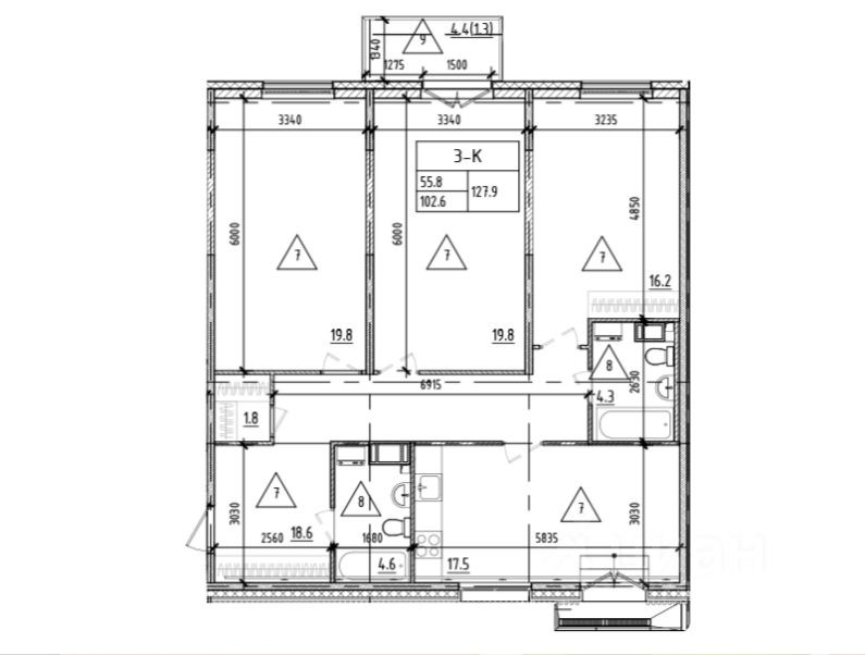 - Общая площадь: 102,1 кв.м. + площадь балкона 4,4 кв.м. и площадь французского балкона.