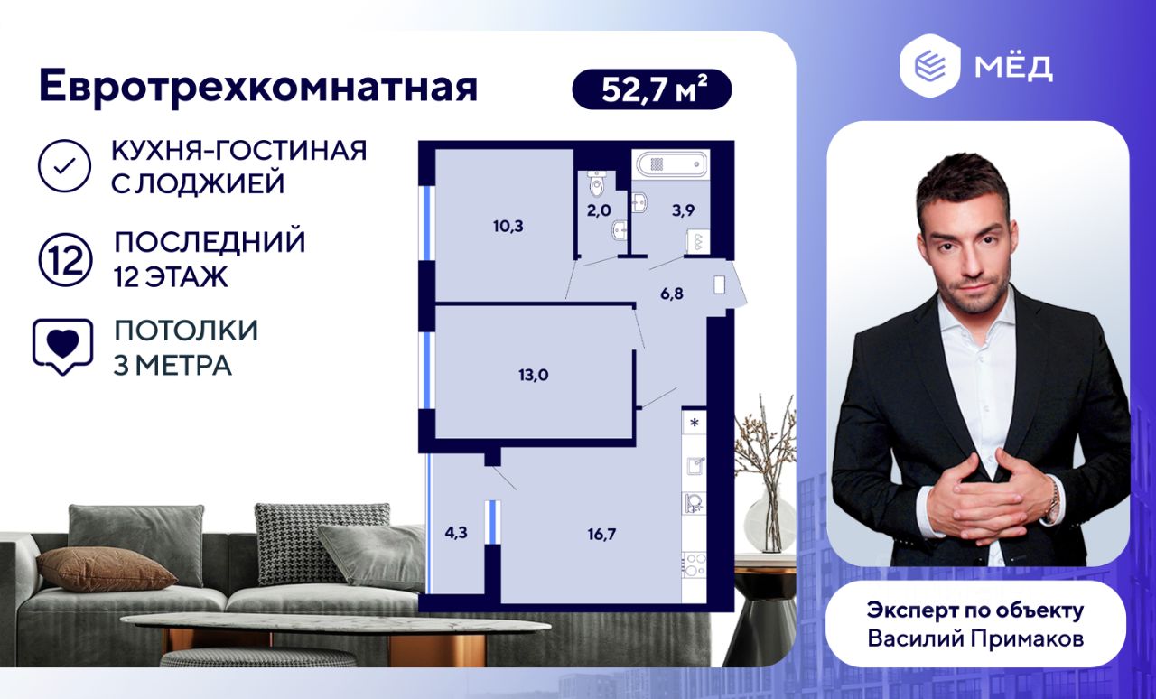 - Общая площадь - 52,7 кв.м без учета лоджии 4,3 кв.м