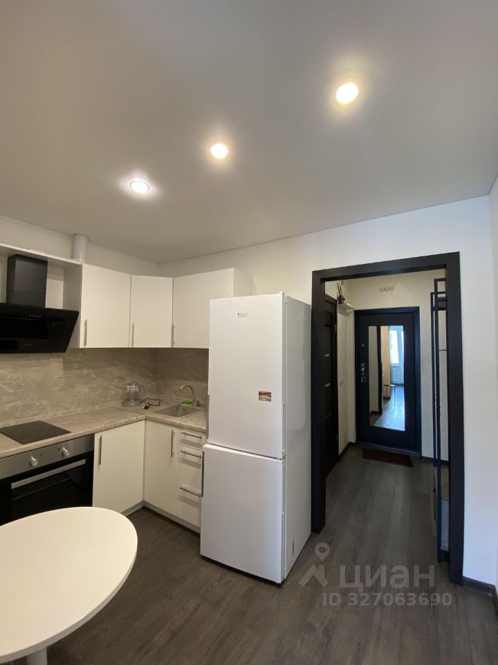 Функциональная кухня: Белоснежный встроенный гарнитур с современной техникой (варочная панель, духовой шкаф, вытяжка) и полноценным холодильником.