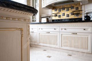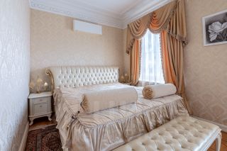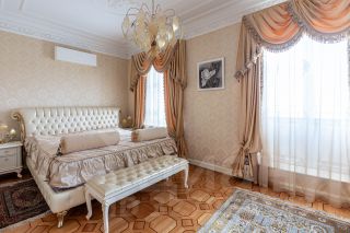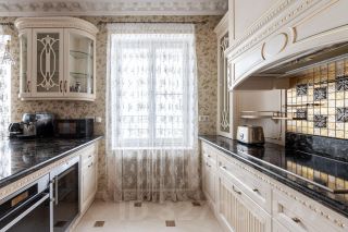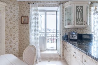 Кухня, площадью 30 квадратных метров, имеет выход на уютный балкончик, что позволяет наслаждаться утренним кофе ,с видом на крыши старого Петербурга. Над ее дизайном поработали итальянские мастера фабрики Маrtini, с применением округлых форм, муранского стекла, темной мраморной столешницей встроенной техникой Крреrsbusсh и Liеbhеrr.